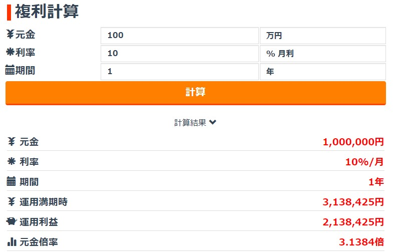 もちろん相場によって変動しますが、仮に毎月10%資金が増えて複利運用したとすると、1年間で約3倍になる計算です。